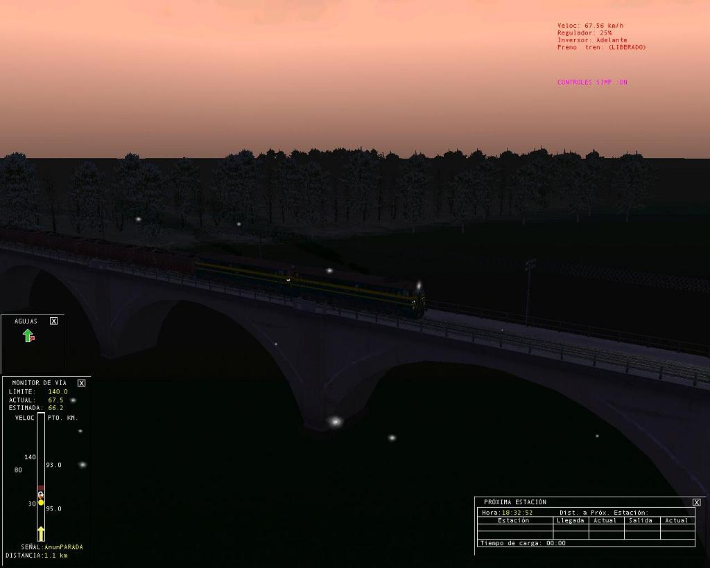 Hola amigos, cumpli con esta segunda parte, luego de haber hecho el Siderurgico hice el Chatarrero, terminada en 02:40:57, bastantito mas de lo previsto, y como me fui demorando cuando llegue a Soria-Cañuelo tuve que hacer algunas maniobras para dejar el paso libre a mi formacion, muy entretenida al igual que la anterior, muy precisos los mensajes y el paisaje que va cambiando de atardecer a la noche oscura. Tambien aproveche la oportunidad para ponerle esta cabina nueva de Alco a la loco de mi tren, asi que todo MUY BUENO. De recuerdo les dejo algunas imagenes que pude tomar en el recorrido.