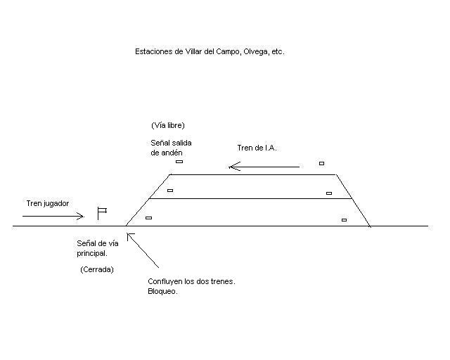 El esquema es simple, y está así para que se entienda más fácilmente. El tren en IA ha entrado en la estación y la señal del andén está en vía libre. La rebasa, y se encuentra que la señal principal, de brazo, está cerrada. Se queda delante de ella. El tren del jugador llega momentos después a la estación, y se encuentra la señal cerrada. Ninguno de los dos trenes puede avanzar, por lo que se produce el bloqueo. Solución para arreglar la actividad: retrasar la llegada del tren de IA o mover hacia la estación anterior el tren del jugador. Pero el problema en la ruta persiste.