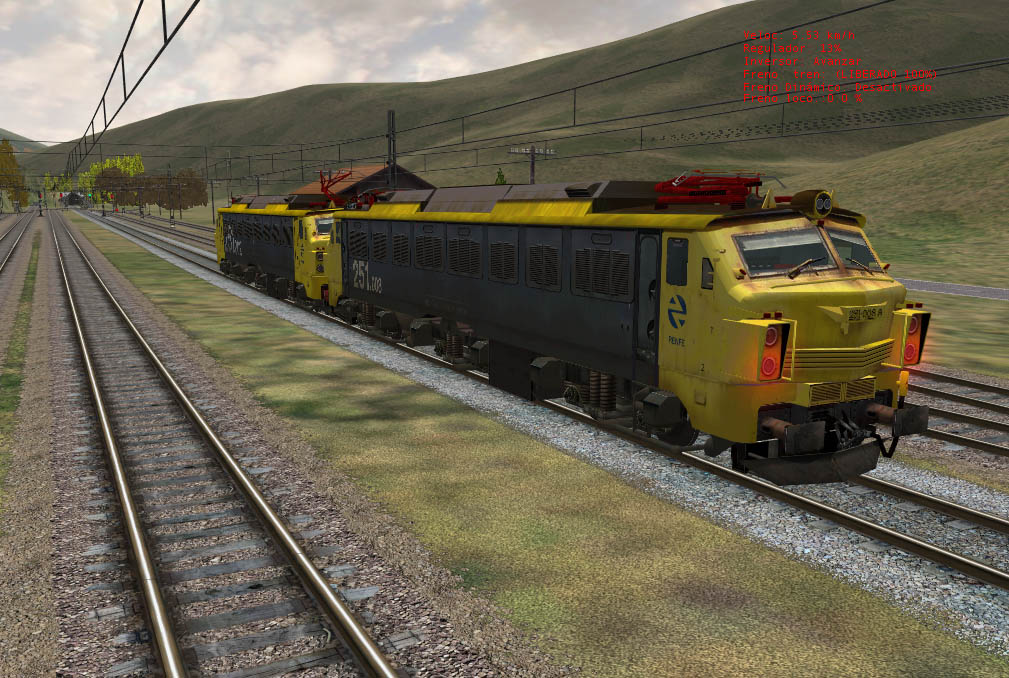 La 251.002 arrastra a la 251.008 estropeada. Como verás, la 251.008 en cola lleva las luces encendidas y el pantógrafo bajado. La 251.002 se está encargando de llevar a su hermana a talleres. Para hacer esto utiliza el Route Riter. No te va a modificar la locomotora que elijas para estropearla, solo le va a cambiar el nombre con un símbolo delante. De la misma forma puedes actuar con el modelo que desees: 252, 319, GP38...