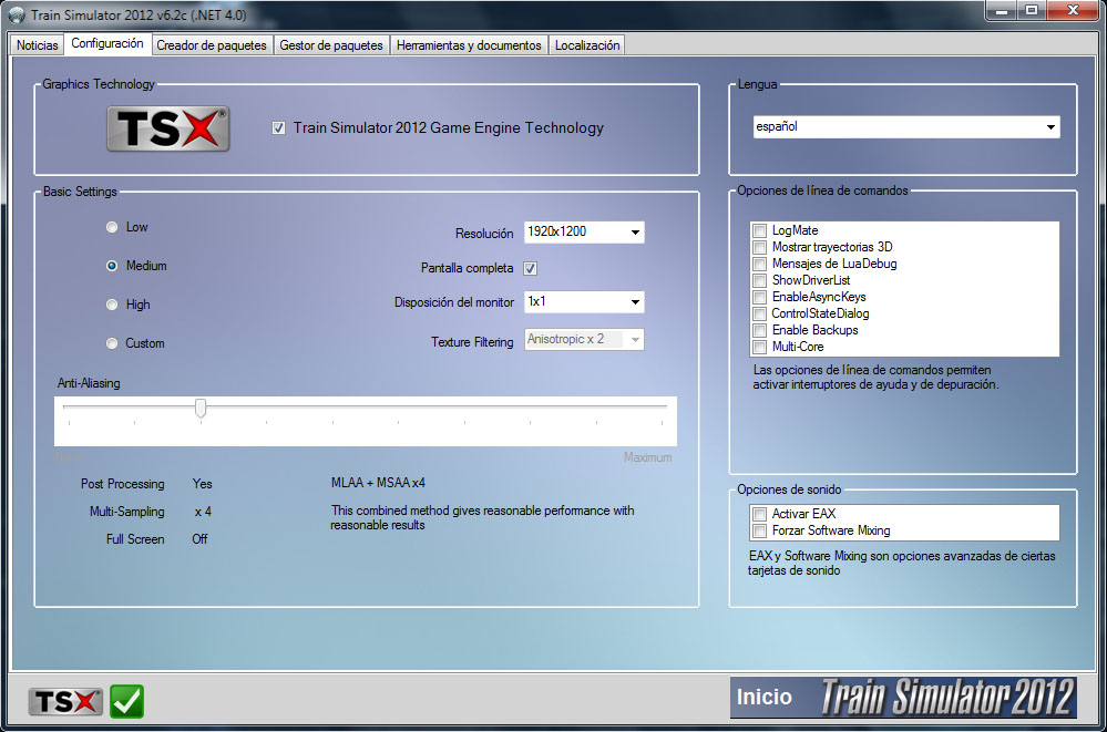 ... selecciones TSX (el nuevo motor gráfico) y la configuración básica (Basic Settings) puesta a Medio (y que él aplique los parámetros que quiera). Supongo que correrás el simulador en pantalla completa, en cuyo caso indica la resolución de tu monitor, aunque en la desesperada situación de que al final no consigas que el juego vaya suficientemente suave siempre puedes seleccionar una resolución inferior.