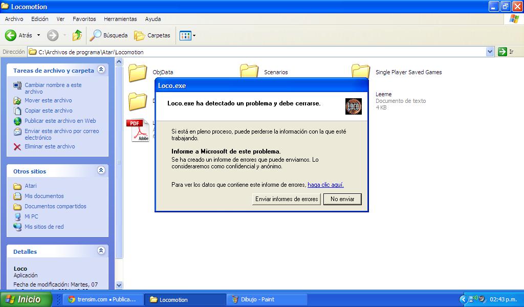 Tengo un pequeño gran problema. Estuve leyendo un tutorial para "pasar" trenes de MSTS a Locomotion, sigo todos los pasos que me dice el tutorial, cuando termino de pasar el coche y lo instalo en Locomotion, al iniciarlo comienza a comprobar los archivos de objetos normalmente, pero cuando esta por finalizar me envia un error en que me dice que el Locomotion a dejado de funcionar (les dejo una imagen para que vean el error).
