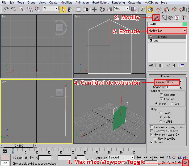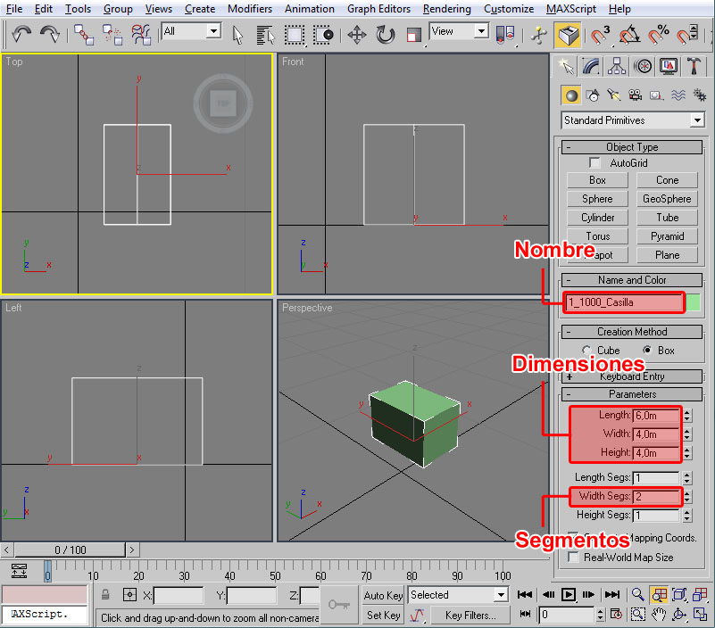 A destacar también que si hacemos clic con el botón izquierdo del ratón sobre el nombre del viewport, este pasa a ser el viewport activo sin perderse la selección del objeto actual. Esto es importante para poder editar un objeto de forma continuada en todos los viewports, como veremos más adelante.