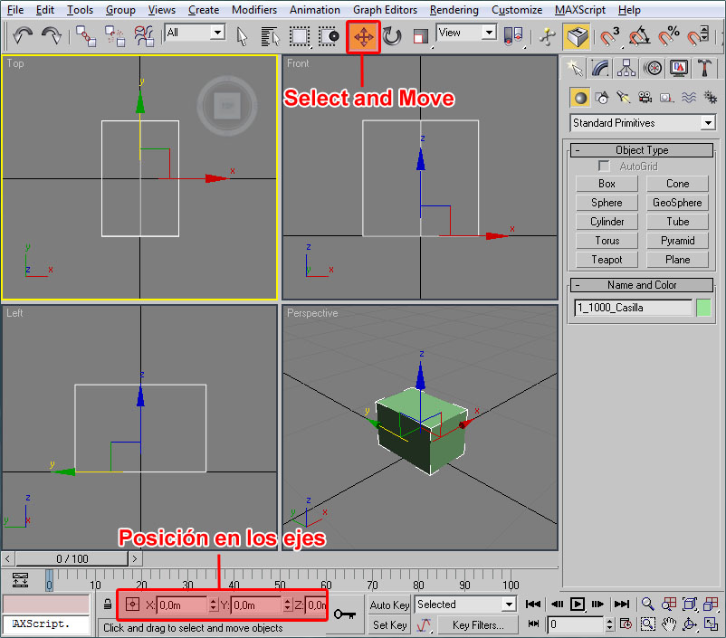 • Absolute Mode Transform Type-in: En este modo los valores se aplican de forma absoluta. Es decir, si un objeto que está a 8 metros en el eje X le aplicamos con la herramienta Move un valor de 2 en el eje X, el objeto se situará a 2 metros en el eje X (se desplazará a dos metros del centro de coordenadas de la escena, ignorando su situación inicial).
