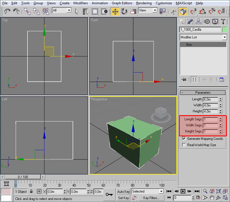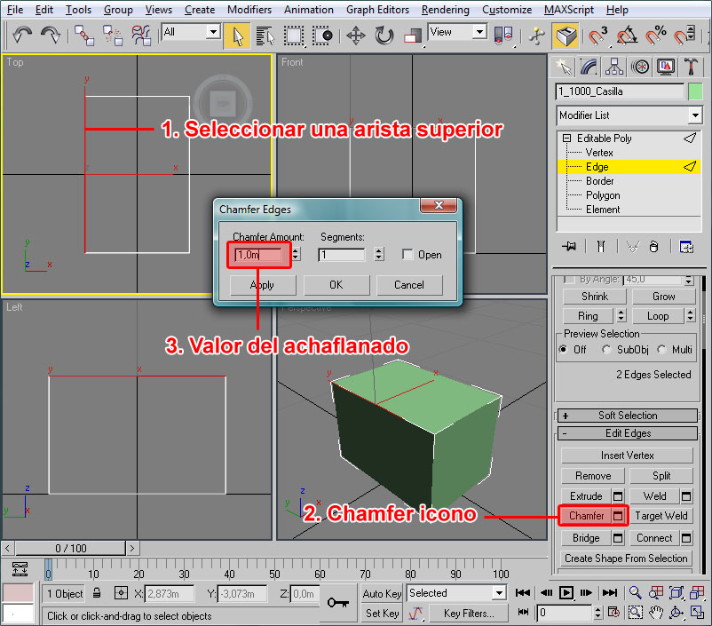 Si una vez ejecutado uno de estos procedimientos en el modelo no se aprecia ningún cambio, será seguramente porque el botón "Show Map in Viewport" no está pulsado. Pues lo pulsamos y ya nos debe aparecer la casilla correctamente texturada, por lo que podemos cerrar la ventana del "Material Editor" y apreciar la casilla en el editor 3D:
