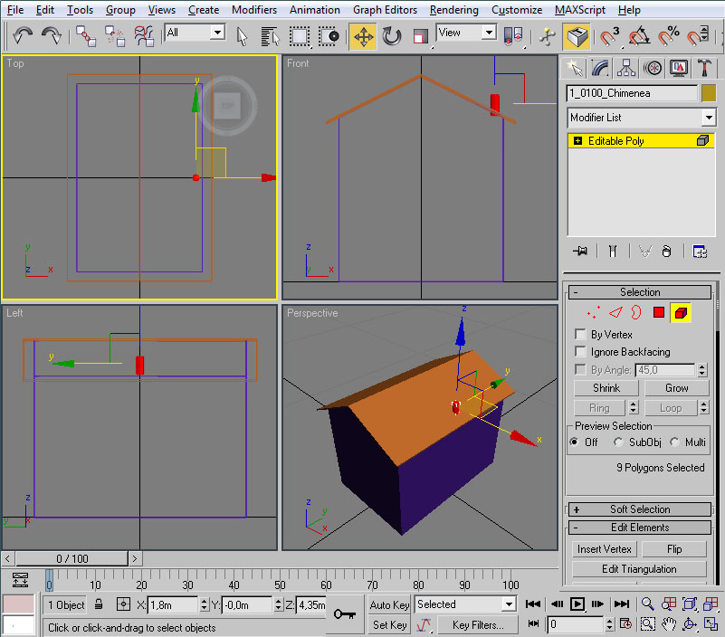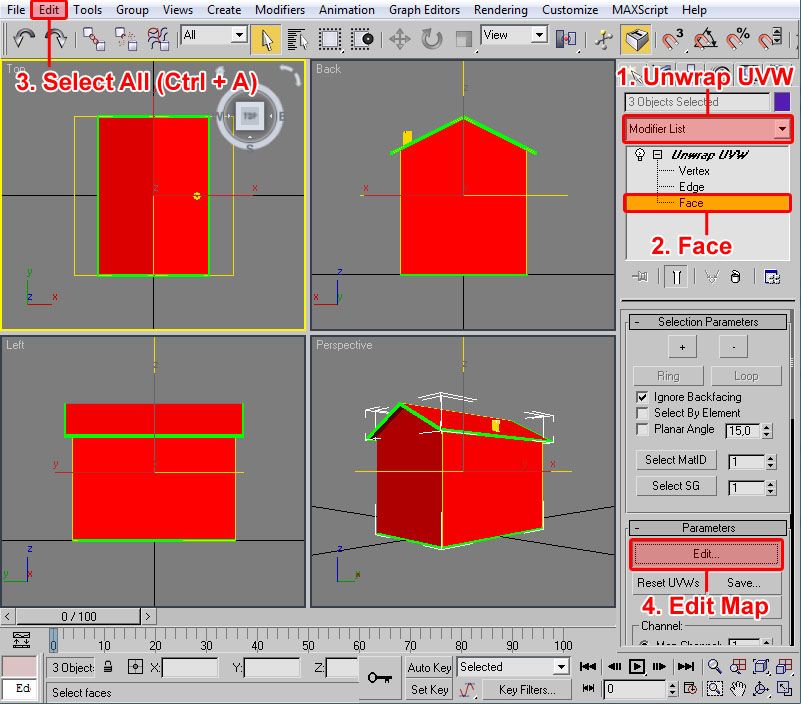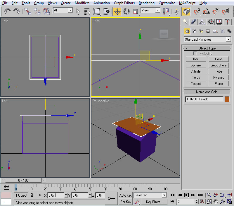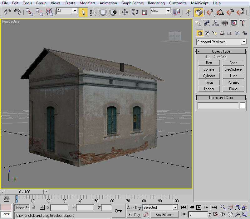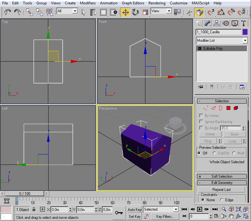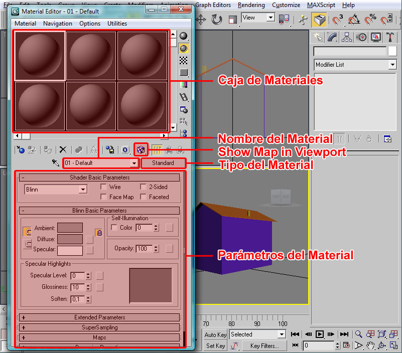 Con esto ya tenemos preparado el material para nuestra casilla, con su textura y su configuración de iluminación. Ahora la pregunta que nos surge es ¿cómo le aplico el material al modelo? En primer lugar deberemos tener seleccionado el/los elemento/s a los cuales vamos a asignar dicho material. Como en nuestro caso serán todos los objetos de la casilla nos bastará seleccionarlos con "Control" + "A". Un vez realizado esto tendremos varias maneras (como suele ser común en 3ds por lo que vamos viendo) de llevar a cabo la asignación: