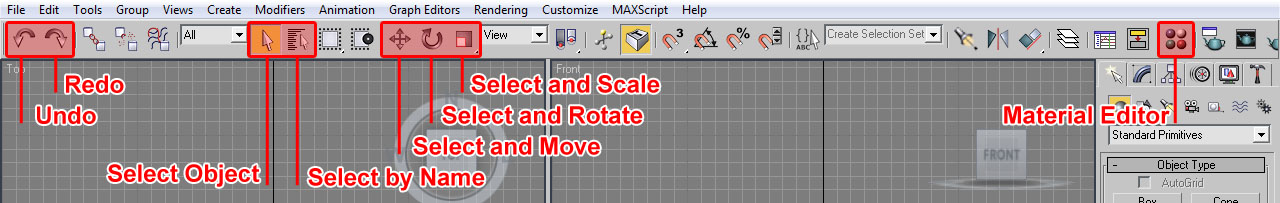 Bajo el menú del programa, eso del "File, Edit, Tools, Group, etc...", nos encontramos una barra de botones horizontal: la Main Toolbar o barra principal, que está llena de dibujitos (en abundancia) como para impresionar. Que digo yo: "a estas alturas ya estoy más impresionado que un fotograma de los hermanos Lumière"; vamos, que no hacía falta tal exhibición... De todas formas, como ya le voy cogiendo el truco al 3ds este, pasaremos de todos ellos y nos fijaremos tan sólo en los que nos parecen más sensatos para nuestro nivel UP: