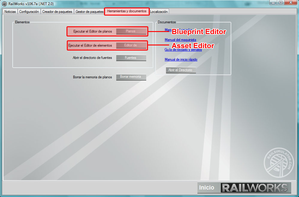 Iniciaremos RailWorks, y de la ventana de presentación elegiremos la pestaña "Herramientas y Documentos" donde encontraremos las dos herramientas que nos permiten generar modelos para el simulador.