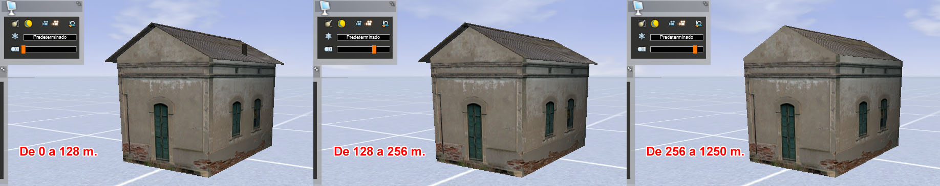 Podemos mostrar u ocultar la "Collision Box" (luego lo vemos) pulsando repetidamente en el icono "Activar cajas de colisión". En esta previsualización podemos comprobar de forma sencilla cómo actuará el simulador con los LODs según la distancia a la cual se encuentre la cámara. Bastará desplazar la barra "Nivel de detalle" para que apreciemos como los diferentes nodos del modelo se visualizan en la distancia: