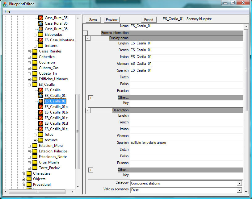 Ante todo se nos preguntará por el "tipo" de blueprint que queremos crear. Elegiremos un "Scenery blueprint", que es el apropiado para nuestra casilla, y en general para todo tipo de objetos escénicos. Antes de que nos olvidemos, le cambiaremos el nombre al archivo creado por uno que nos indique su contenido, por ejemplo "ES_Casilla_01", y podremos proceder a ir cumplimentando los campos del blueprint que nos interesen: