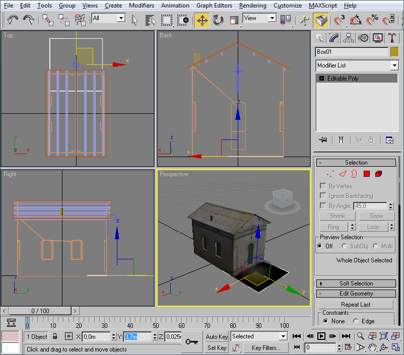 Con el mismo procedimiento crearemos un polígono para cubrir la fachada frontal del edificio. El cubo será esta vez de 4x4x4 metros, y los vértices a eliminar lo serán los "posteriores" del cubo: