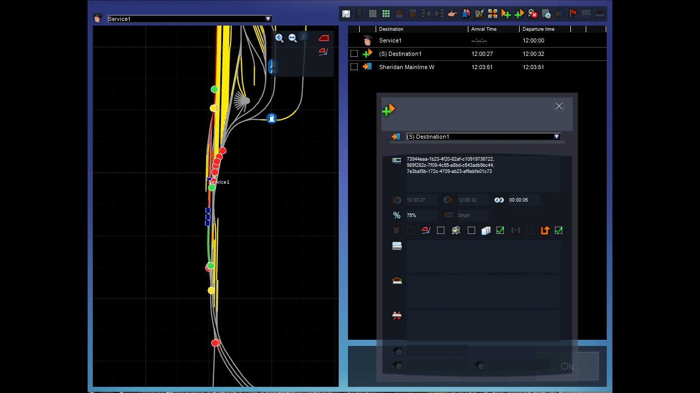 Desenganchar resulta más sencillo que enganchar. Le indicas a la tracción IA que desenganche en un apartadero, plataforma o destino, le estableces un destino de salida, y la IA desengancha el material indicado en la instrucción.