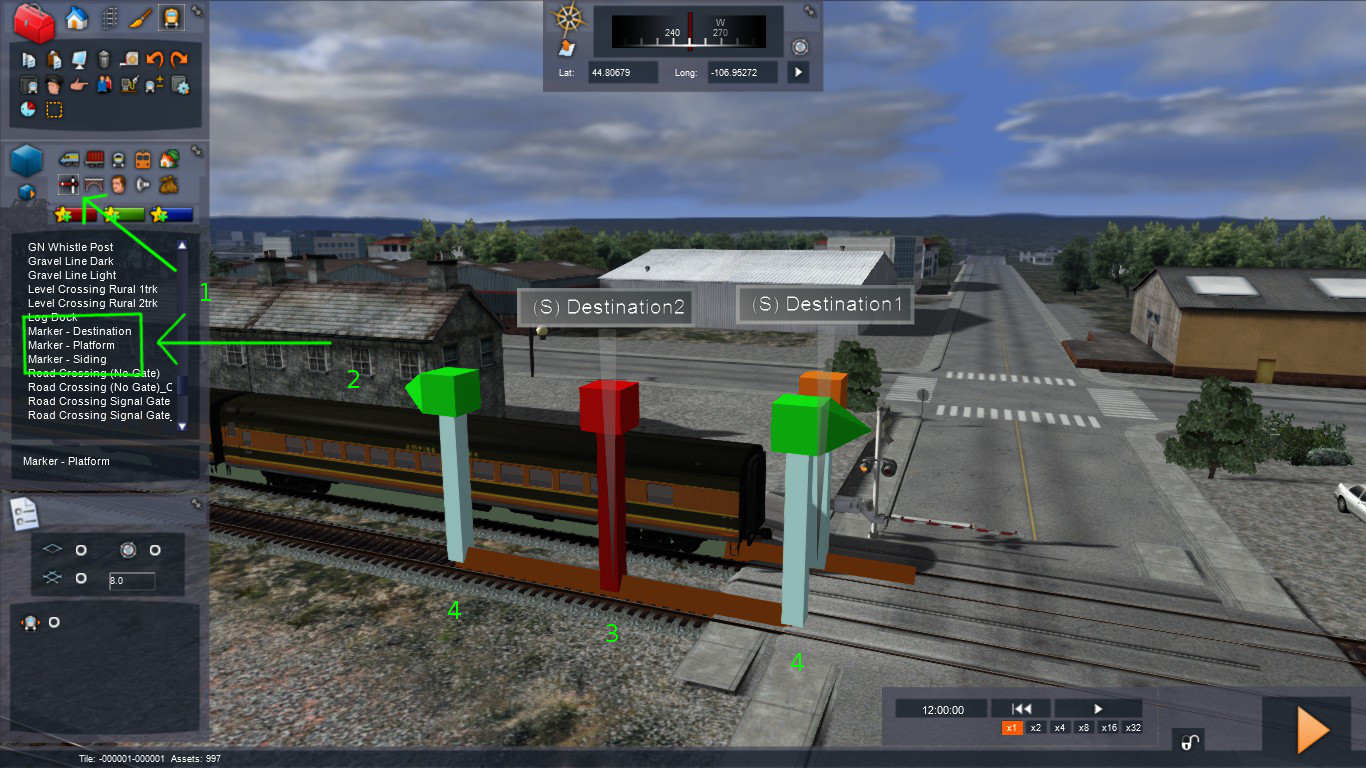 Los marcadores de via se encuentran en el panel de objetos de escenario con el icono de la señal mecánica. Os dejo unas capturas para que veais como se pone un marcador de via desde el editor de escenarios sin necesidad de alterar la ruta: