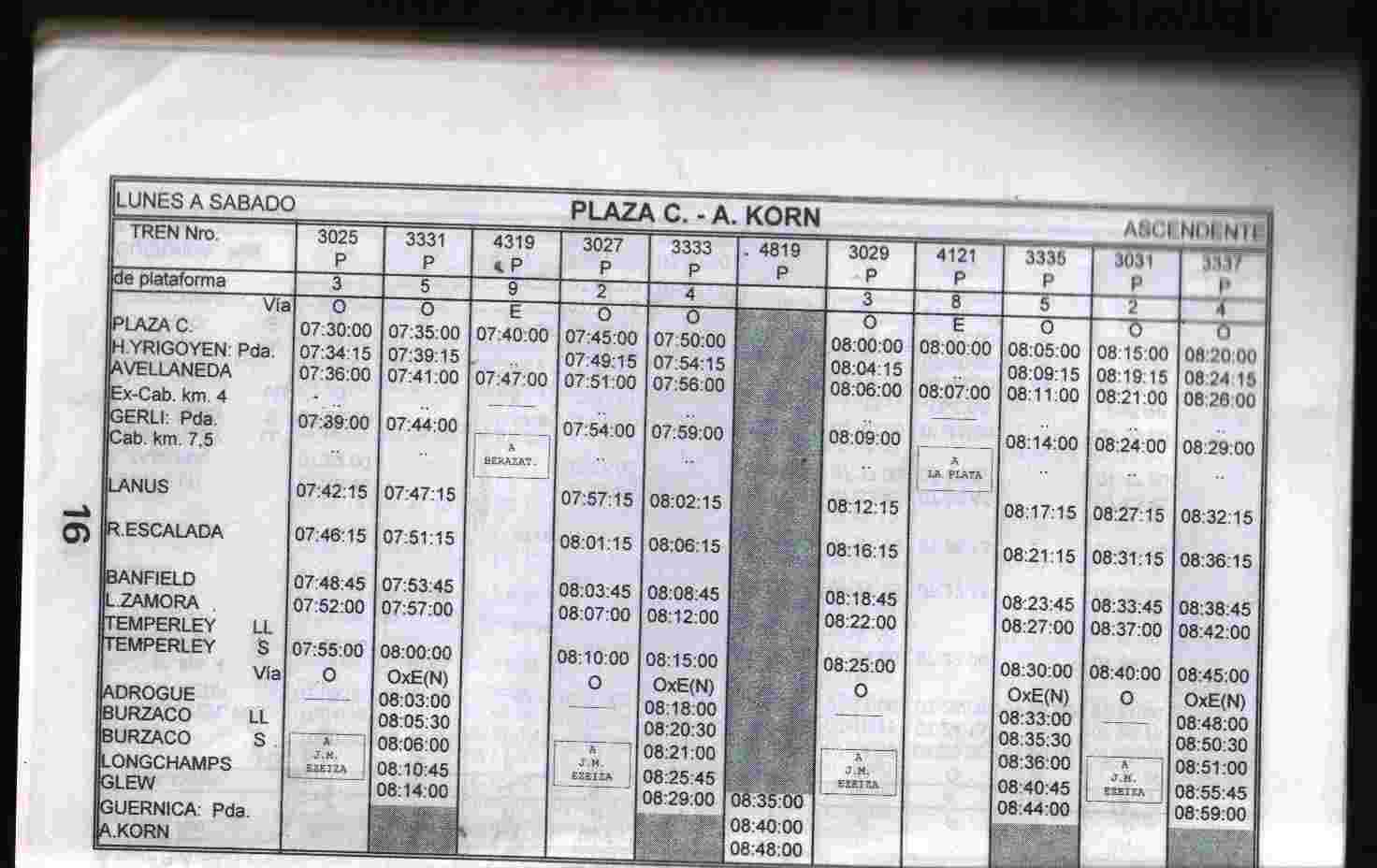 Actualmente el servicio eléctrico está prolongado hasta Alejandro Korn, pero en la época en que finalizaba en Glew, había varios servicios diésel diarios hasta Alejandro Korn, como puedes apreciar en el itinerario del año 1995: