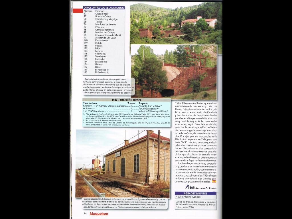 Edito me ha aparecido un esquema de la estación de Cella del documento de G.Portas con fotos del archivo de Jualio Alberto Cendón creo no se si se escribe así !OJO¡ hay una vía por el otro lado del edificio de viajeros,para acceder a una derivación, este esquema era habitual de los FF.CC franceses en líneas secundarias y de Norte y MZA, lo digo por si en la ruta, Cella no habías pensado poner esa vía del otro lado del edificio es decir lado calle mañana pongo la foto aclaratoria,que no son horas.