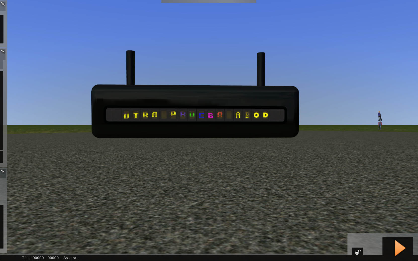 Ya he hecho el marcador electrónico, pero no he podido hacerlo como pensaba, dinámico, ya que, para variar, no se ha implementado aún en Railworks, en su dia dijeron que sería una de las cosas que vendrian con el Railworks... , habrá que esperar :(, de todas formas las letras se podrán cambiar cambiando la textura, simplemente editandolo con Photoshop. Lo bueno de hacerlo así, es que tenemos mas flexibilidad para poner las letras, la podremos poner del color que queramos, tamaño, tipo de fuente, el lugar..., etc, etc, He utilizado varias fuentes de puntos, que las incluiré en el pack ya que son gratuitas, así no hay ningún problema de copyright ni esas cosas :lol: