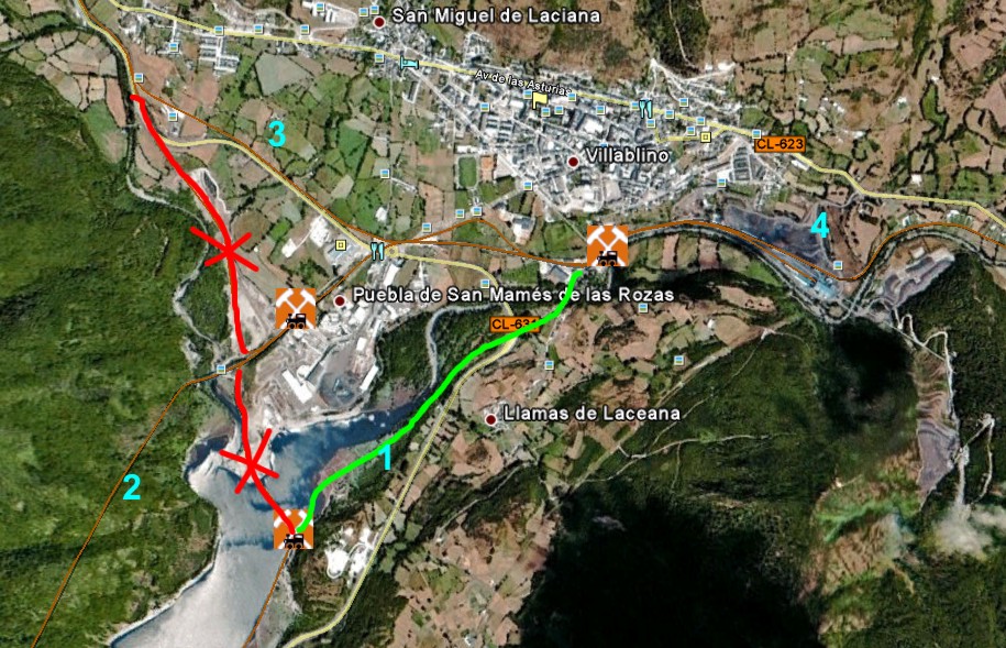 2.- Villablino: La entrada inicial del ferrocarril era el trazado (1) en verde, no el tachado en rojo. El (2) es el actual desde la construcción del embalse. El otro tramo tachado nunca existió. (3) Ramal de Caboalles y (4) Villaseca.