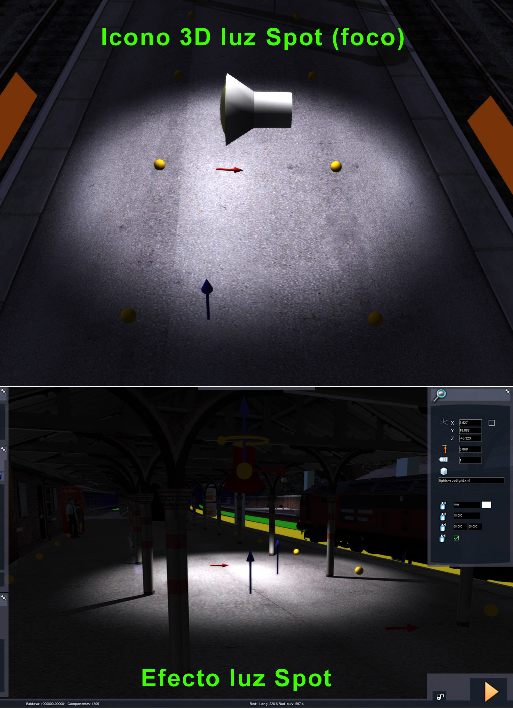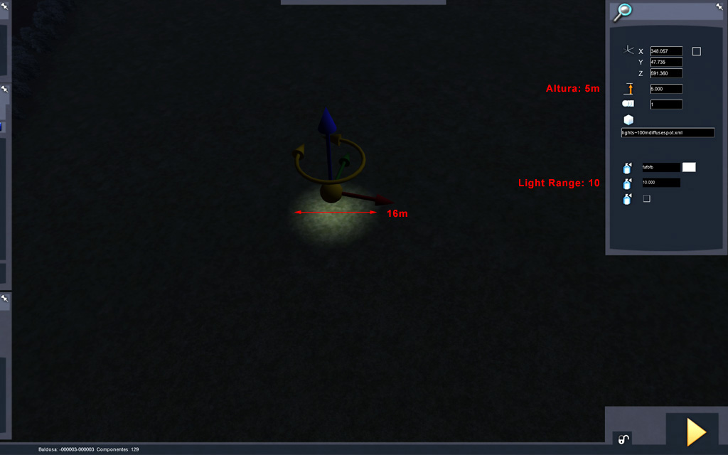 Vamos a conocer mejor los parámetros de ajuste de Altura (terreno) y Light range (intensidad) de las luces Spot: