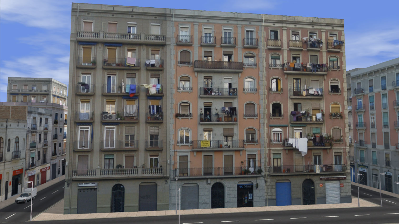 Tres edificios urbanos de seis plantas. Tienen una misma línea arquitectónica, pero con diferentes acabados (y algún vecino ha aprovechado para hacer la colada)