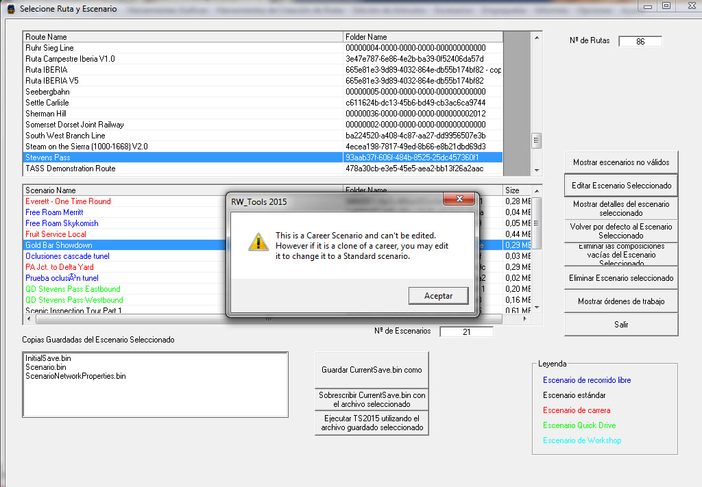Es que a mí también me ha pasado lo que comentas en la ruta Stevens Pass, y creo que es porque está empaquetada en *.ap. Si no me equivoco, para poder guardar los cambios al editar una ruta o un escenario, estos tienen que haber sido desempaquetados previamente del archivo *.ap que los contiene.
