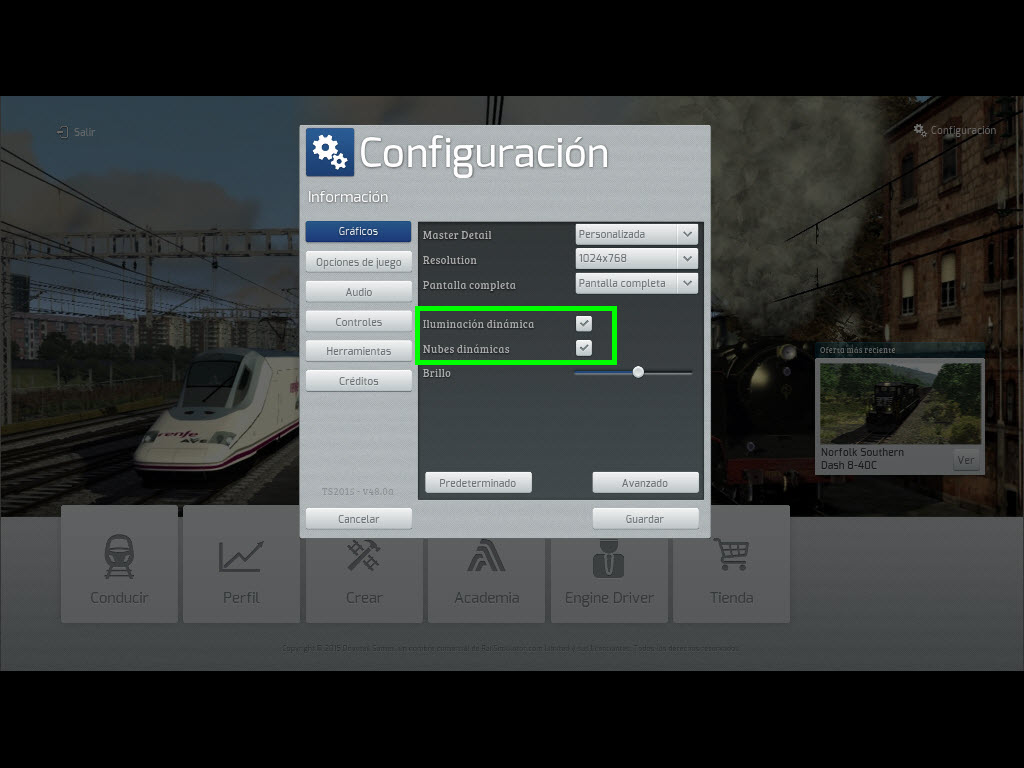 Y seguramente también se perderá el acceso a las opciones gráficas "Iluminación dinámica" y "Nubes dinámicas", ya que son opciones de características nuevas que no existían en TS2014.